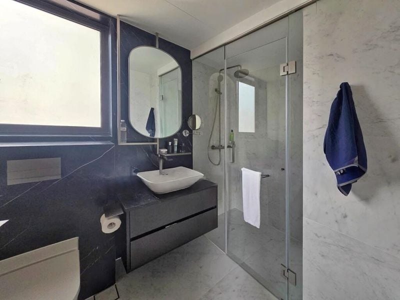 This thoughtfully designed 2-bedroom unit features a seamless flow between spaces, with modern finishes that include light wood flooring in the bedrooms and built-in wardrobes with glass doors. The integrated kitchen boasts marble-look countertops, a sleek undermount sink, and high-quality appliances, making it a chef's delight. Enjoy the comfort of air conditioning in the bedrooms and the convenience of a ceiling fan in the living area, perfect for those warm Singapore days.