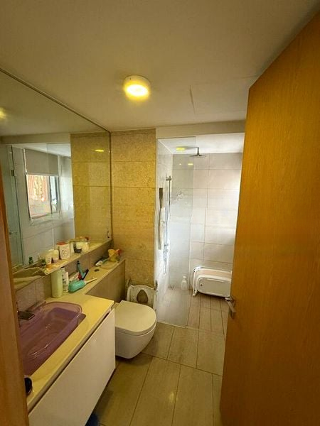 This well-maintained 2-bedroom, 2-bathroom unit features standout elements such as a stylish kitchen island, a glass shower partition, and wood-look flooring in the bedrooms. The spacious living area flows effortlessly into the dining space, making it perfect for entertaining or relaxing at home. The modern bathroom boasts a unique purple integrated sink basin, adding a touch of elegance to your daily routine.