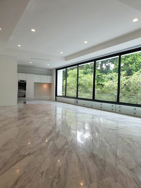 Step into a world of elegance as you enter this beautifully renovated unit, where abundant natural light floods through floor-to-ceiling glass doors, offering serene views of the pool and lush greenery. The polished marble flooring enhances the modern minimalist ambiance, creating a tranquil retreat that feels both spacious and inviting.