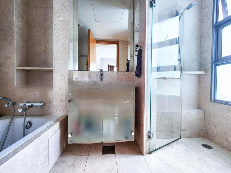The well-maintained unit features a spacious open layout, with a stylish living room that flows effortlessly into the dining area. The master bedroom boasts wood parquet flooring and a minimalist design, while the bathrooms are luxuriously appointed with a separate bathtub and glass shower stall, complemented by marble-look wall tiles. A versatile study can easily serve as a guest bedroom, making this home both functional and inviting.