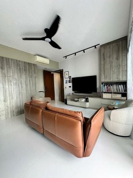 Step into a sanctuary of light and space at Foresque Residences, where abundant natural light floods the living area, accentuating the elegant wood-look feature wall and creating a bright, airy ambiance. Large sliding doors lead to a spacious balcony, offering unobstructed views of lush greenery, perfect for relaxation or outdoor dining.
