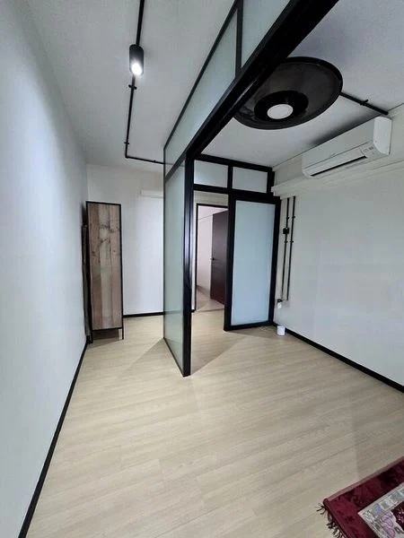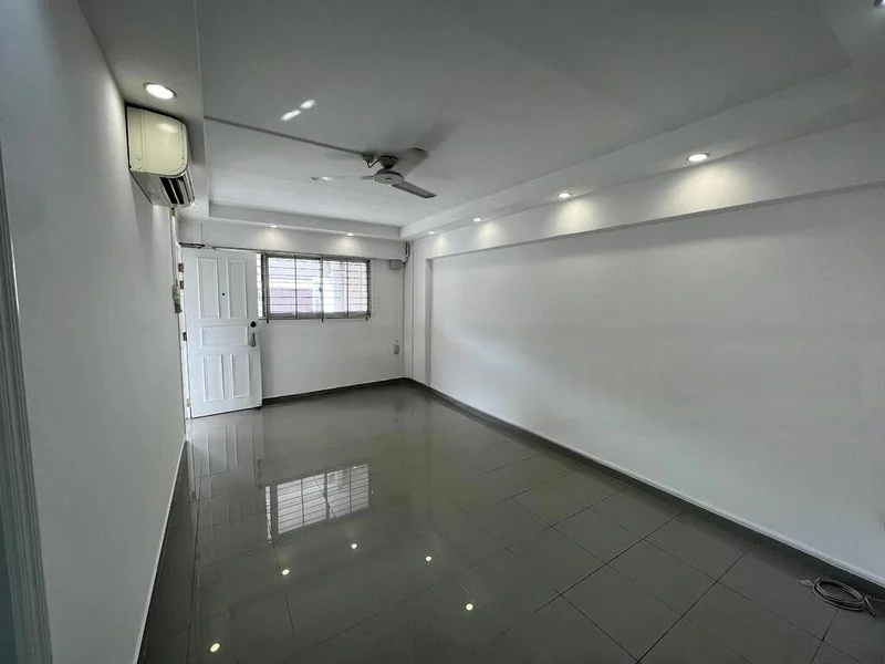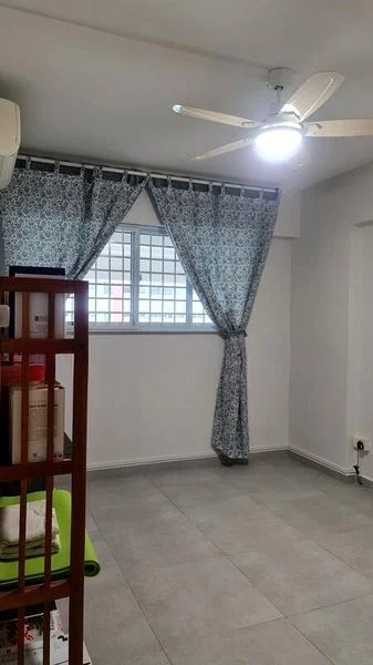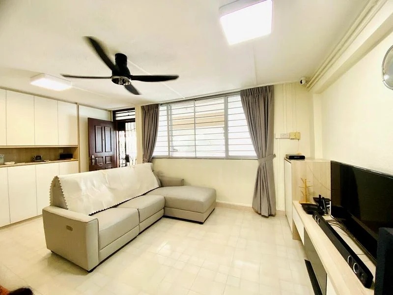 Step into a bright and airy sanctuary at 456 Tampines St 42, where abundant natural light floods the spacious living area, accentuating the traditional wooden swing and large windows that frame views of lush greenery and neighboring blocks. The ambiance is inviting, making it an ideal space for relaxation and gatherings.