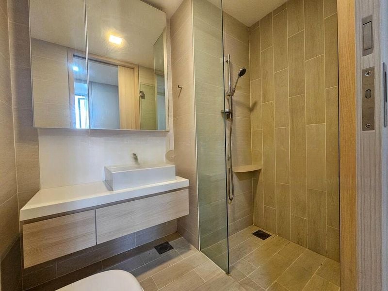 This well-maintained 2-bedroom unit features a stylish island kitchen with wood-finish cabinetry and white solid surface countertops, perfect for culinary enthusiasts. The bathrooms are designed for comfort, showcasing a wall-hung toilet, a walk-in shower with a rain shower head, and a floating vanity. The master bedroom boasts a built-in mirrored wardrobe, enhancing the sense of space and light throughout the home.