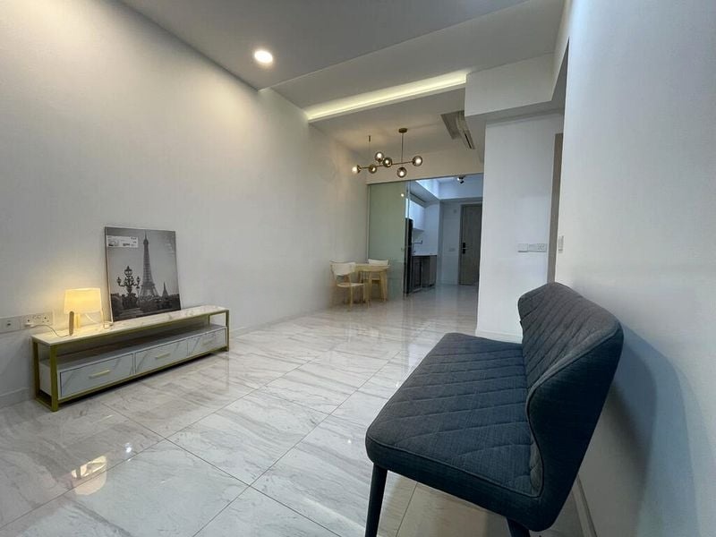 Step into a world of modern elegance as you enter this beautifully renovated 2-bedroom unit at The Alps Residences. The marble-look floor tiles glisten under the recessed ceiling lighting, creating a bright and inviting atmosphere. The open-plan living and dining areas are accentuated by a designer pendant light, enhancing the minimalist aesthetic while offering a seamless flow for entertaining.