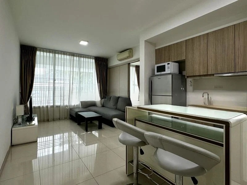 Step into this well-maintained 1-bedroom unit at Optima @ Tanah Merah and be greeted by a modern minimalist ambiance. The open-concept layout allows for seamless flow between the living and dining areas, highlighted by a square white dining table and translucent chairs that invite light into the space. Sliding glass doors lead to a balcony, offering a glimpse of the surrounding greenery, while the grey fabric sofa and mobile coffee table create a cozy yet stylish living area.