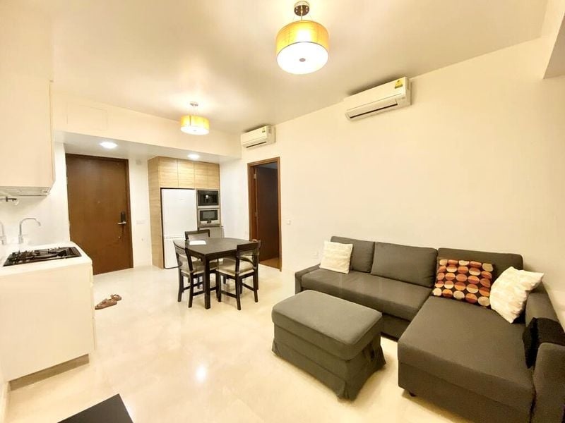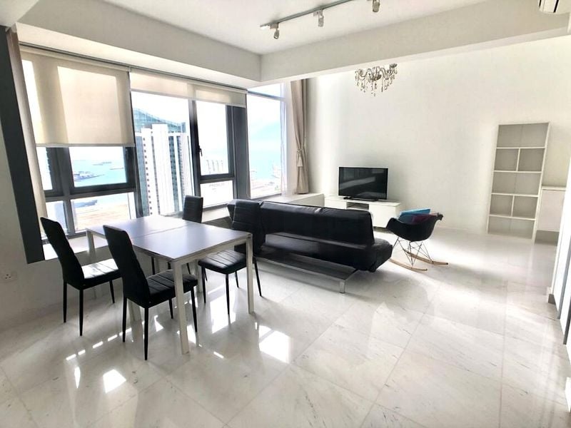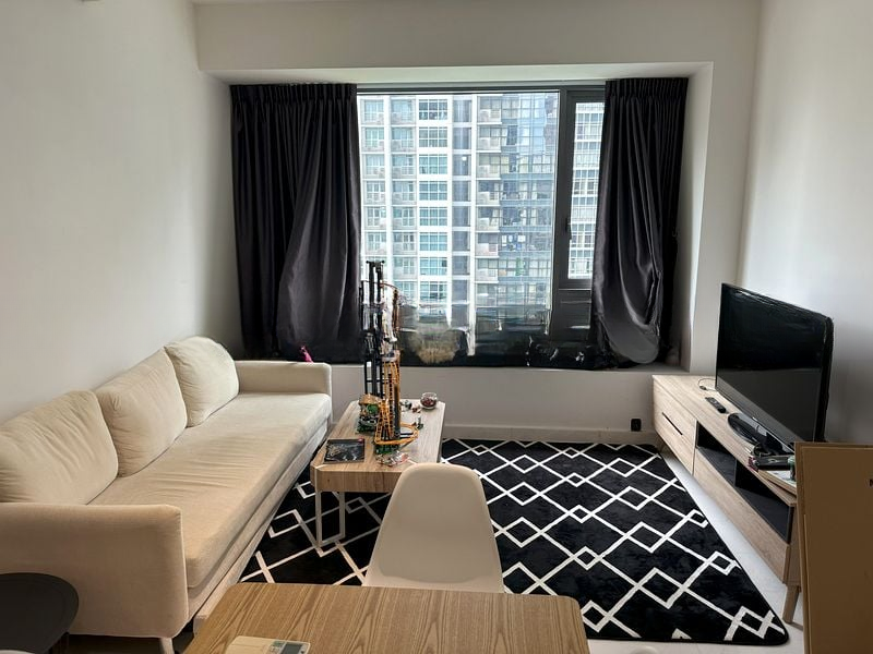 This well-maintained 1-bedroom unit features an efficient layout, with a spacious living area seamlessly connected to the kitchen. The master bedroom boasts a built-in wardrobe and its own bay window, enhancing the sense of space and light. The bathroom is a luxurious retreat with dark marble wall tiles, a floating vanity, and glass shelving, adding a touch of elegance to your daily routine.