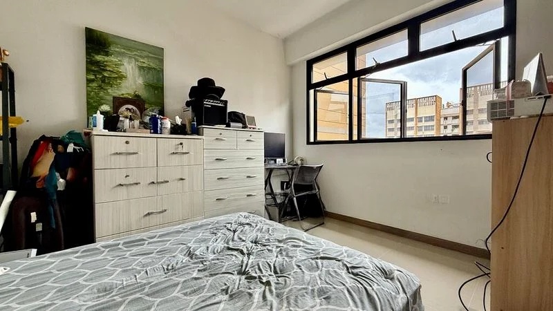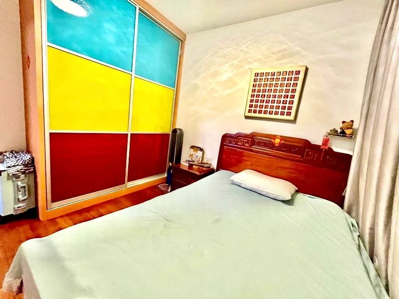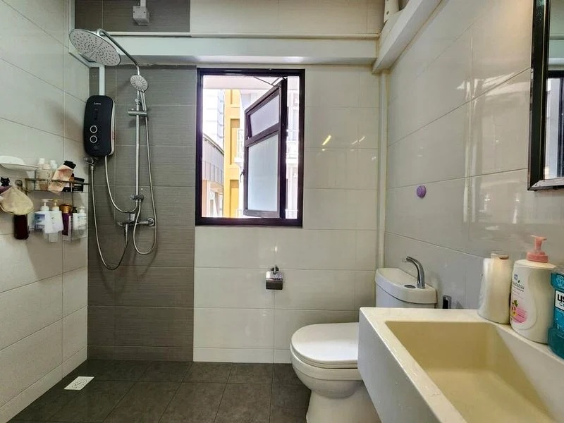 This efficient 2-room flexi layout features a standout modern galley kitchen, complete with sleek black quartz countertops and light wood-look cabinetry. The bedroom boasts a large sliding wardrobe with colorful panels, adding a playful touch to the space. Enjoy the convenience of a glass-enclosed shower in the bathroom, complemented by modern grey floor tiles and a well-designed vanity with storage.
