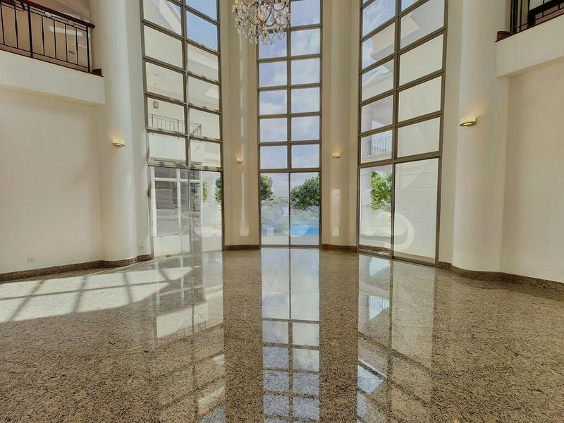 Step into a world of grandeur as you enter this exquisite villa, where abundant natural light floods the expansive living area adorned with polished granite flooring and stunning crystal chandeliers. The impressive triple-volume ceiling creates an atmosphere of luxury, while floor-to-ceiling windows offer captivating views of the lush greenery and the inviting private swimming pool, framed by elegant architectural white columns.