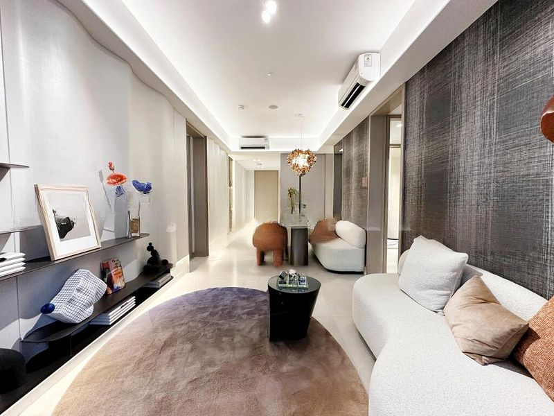 Step into a world of modern luxury as you enter this brand-new, fully-furnished unit at NAVA GROVE. The open-concept living space invites you with its elegant marble-look flooring and a striking gold statement pendant light that casts a warm glow over the curved designer sofa. Large windows frame picturesque views of the lush greenery and landscaped gardens, creating a serene ambiance that complements the contemporary architecture.