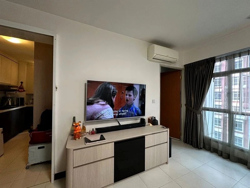 Step into a sanctuary of light and space at The Florence Residences, where abundant natural light floods the living and dining area through large windows, creating a bright and airy ambiance. The modern finishes, including light-colored floor tiles and a stylish white sideboard, enhance the inviting atmosphere, while the unblocked views of greenery and HDB blocks provide a serene backdrop.