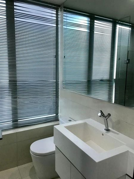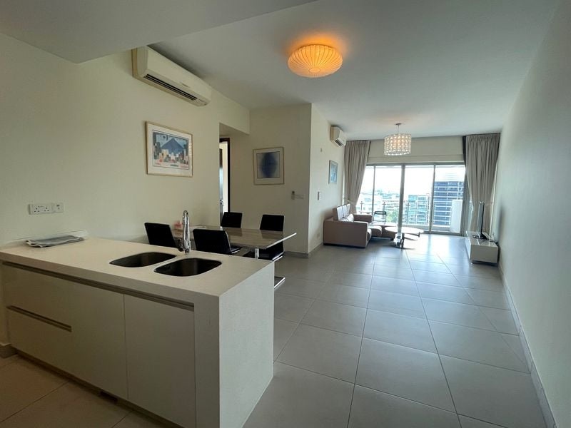 The heart of the home is the stylish kitchen, equipped with white cabinetry, a spacious island with a double sink, and high-end appliances including a gas cooktop and built-in oven. The master suite offers a luxurious retreat with a modular walk-in wardrobe and an en-suite bathroom featuring a rain shower and a mosaic tile bathtub. With minimalist finishes throughout, this unit is perfect for those who appreciate quality and design.
