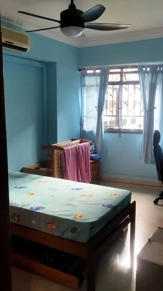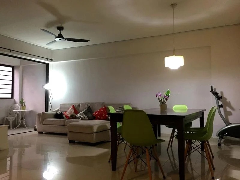 Step into a warm and inviting atmosphere as you enter this well-maintained HDB flat at 504B Montreal Drive. The cozy ambiance is enhanced by moderate natural light filtering through the windows, illuminating the spacious living area adorned with well-kept wooden furniture and potted plants. The ceiling fans in every room add a touch of comfort, making it an ideal space for relaxation.