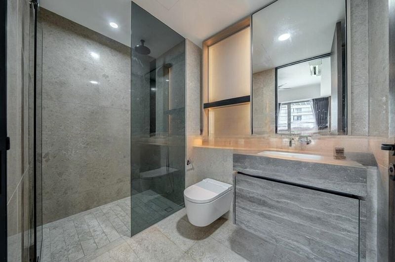 This thoughtfully designed unit features two spacious bedrooms, including a master suite with a large window that fills the room with warmth. The galley kitchen is equipped with an induction hob and integrated oven, complemented by under-cabinet lighting that enhances functionality. The bathrooms are a true highlight, showcasing marble-look tiles and a stylish floating vanity, creating a spa-like retreat at home.