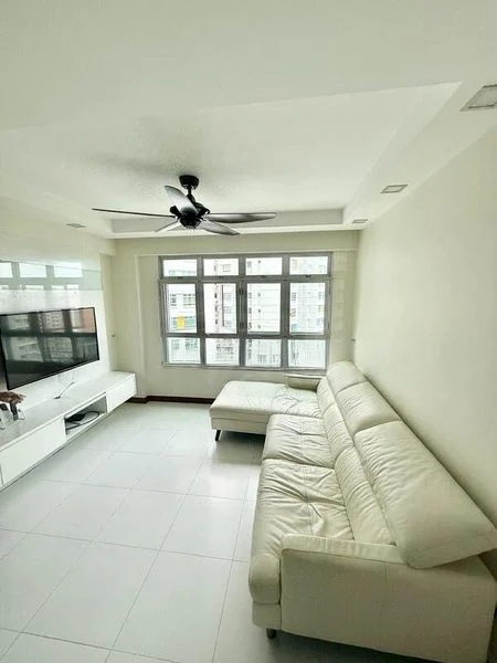 Step into a bright and airy oasis at 451A Sengkang West Way, where abundant natural light dances across the well-maintained interiors. The modern two-tone kitchen cabinetry, complemented by sleek black granite countertops, creates an inviting atmosphere. The living room features a light blue accent wall and white floor tiles, enhancing the spacious feel, while built-in mirrored sliding wardrobes add a touch of elegance and functionality.