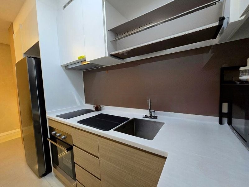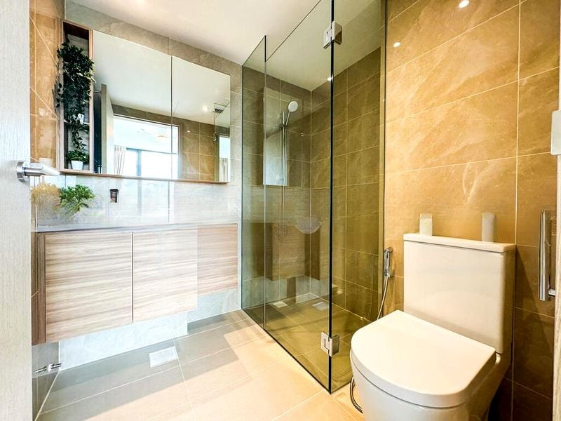 Step into a world of modern elegance as you enter this well-maintained 2-bedroom unit at Treasure at Tampines. The open-concept living area is bathed in natural light, accentuated by polished floor tiles and a geometric pattern rug that invites comfort and style. Sliding glass doors lead you to a private balcony, offering an urban view that enhances the serene ambiance of your home.