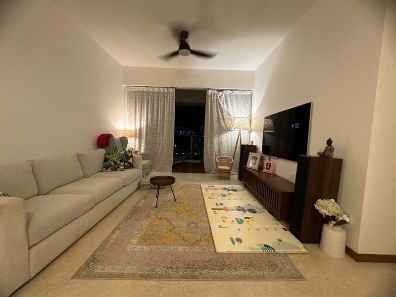 Step into a bright and airy sanctuary at Clover By The Park, where abundant natural light floods the living spaces, accentuating the polished marble-look flooring and inviting ambiance. The sliding glass doors in the living room open up to a spacious balcony, offering unblocked panoramic views of the city skyline and lush greenery, creating a perfect backdrop for relaxation.