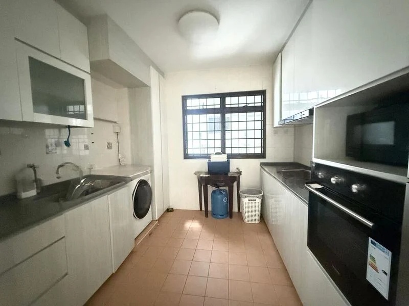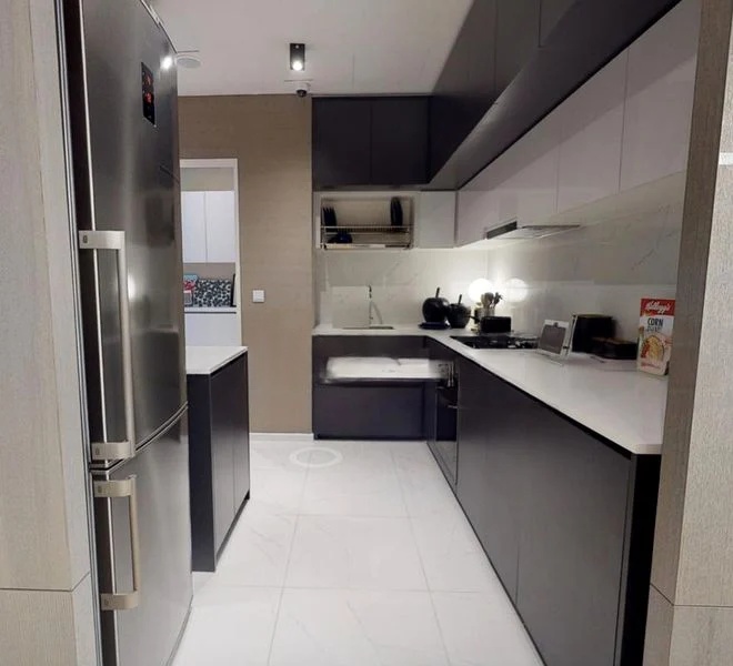 This well-maintained, fully-furnished 3-bedroom unit features standout elements such as a custom platform bed with integrated LED lighting in the master bedroom, built-in sliding wardrobes, and a stylish en-suite bathroom with a rain shower. The additional bedrooms are thoughtfully designed with ample shelving and study space, perfect for family living or home office needs. The kitchen boasts white cabinetry and a glass viewing window, seamlessly connecting to the living space.