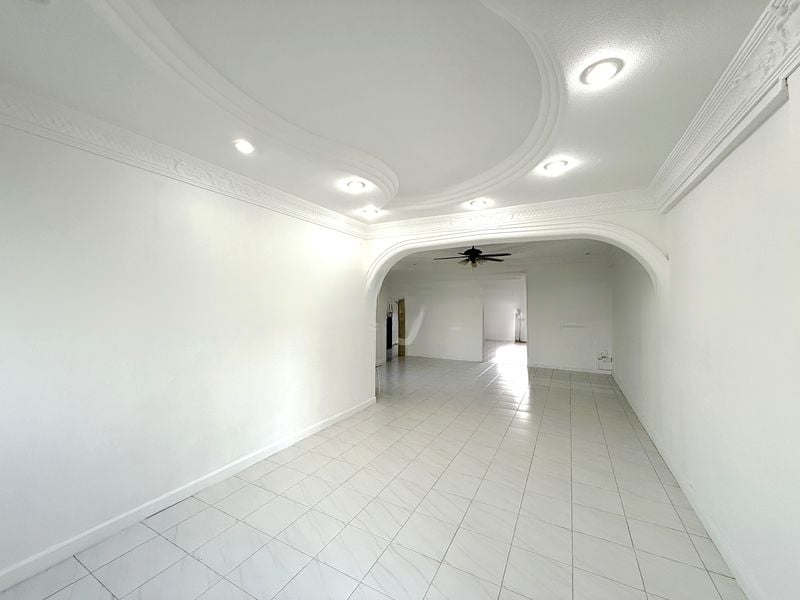 Step into a bright and airy living space where decorative ceiling moldings and recessed lighting create an inviting ambiance. The open-plan layout, complemented by white tiled flooring and an archway partition, offers a seamless flow from the living area to the kitchen, making it perfect for both relaxation and entertaining.