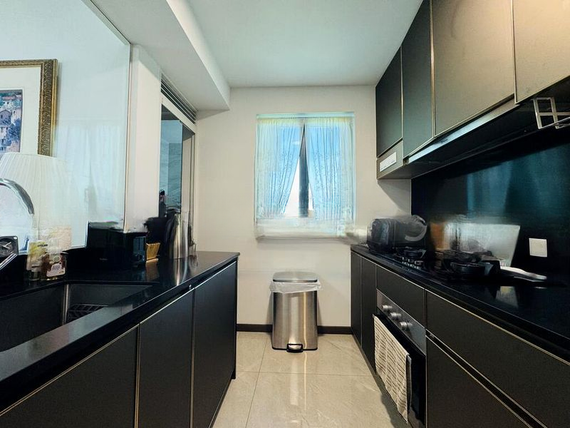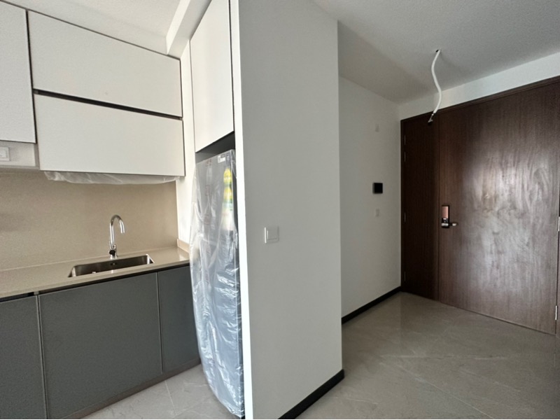 This efficient layout boasts standout features such as a dedicated study nook, perfect for remote work, and a contemporary kitchen with two-tone cabinetry and integrated appliances. The bedroom, with its dark wood parquet flooring and built-in wardrobe with a full-length mirror, provides a cozy retreat. Additional highlights include a digital door lock for enhanced security and split-unit air conditioning for year-round comfort.