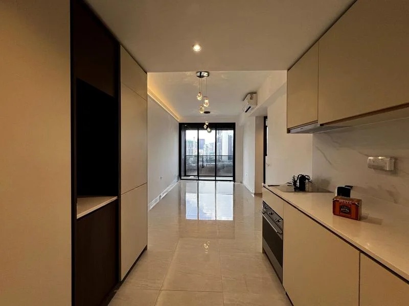 Step into a world of elegance as you enter this brand-new unit at KOPAR AT NEWTON. The abundant natural light floods through the floor-to-ceiling glass walls, illuminating the polished marble flooring and highlighting the luxurious finishes. A massive wave-like crystal chandelier hangs gracefully above, creating an ambiance that is both contemporary and inviting, while the wood-paneled feature walls add warmth to the urban landscape views.