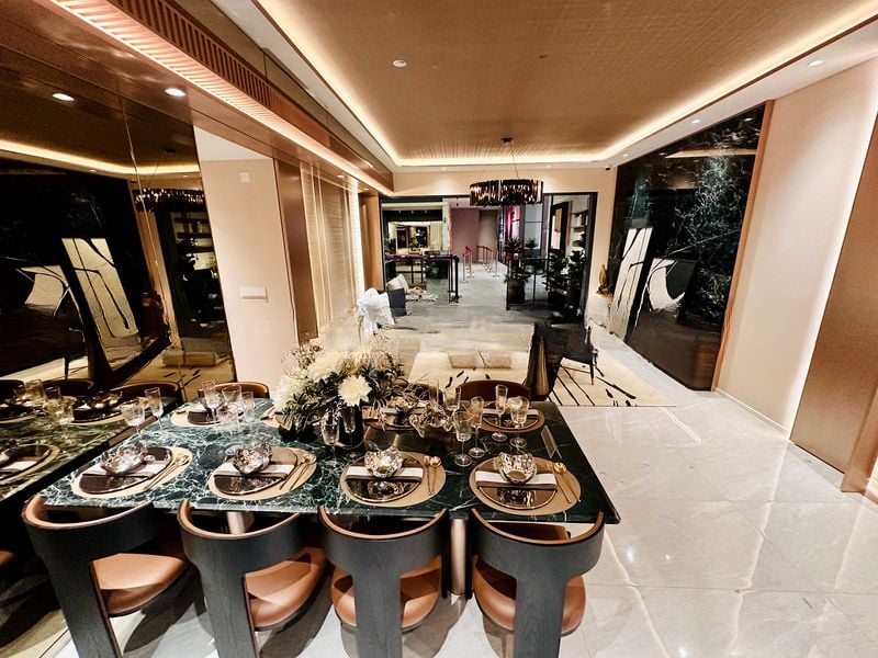 Step into a world of modern elegance at Parktown Residence, where a brand-new designer flat awaits. The moment you enter, you are greeted by an open-concept living space adorned with large format marble-look floor tiles and cove lighting that creates a warm, inviting ambiance. The artistic area rug adds a touch of sophistication, while the designer feature wall with dark stone texture captivates your attention, complemented by views of lush greenery and the urban skyline.