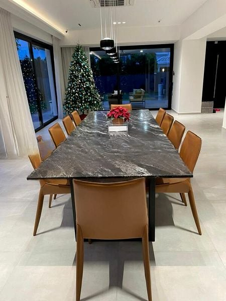 Step into a world of modern elegance as you enter this beautifully renovated home at Mistral Park. The open-concept dining room welcomes you with a large marble dining table, designer pendant lighting, and floor-to-ceiling glass sliding doors that invite natural light and offer serene views of lush greenery. The ambiance is a perfect blend of minimalist design and sophistication, creating a warm and inviting atmosphere.