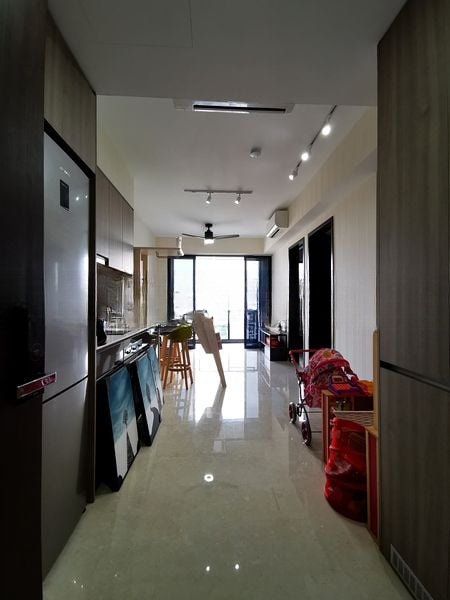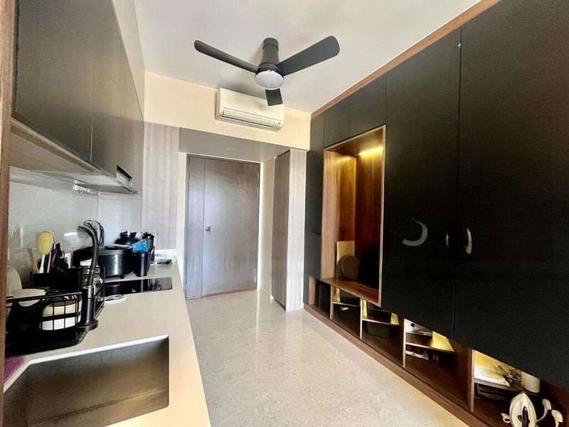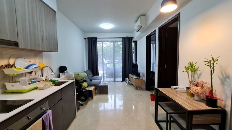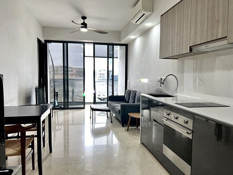 Step into a sanctuary of modern elegance with this beautifully designed 1-bedroom unit at Botaniqu at Bartley. The open-concept living area welcomes you with a sleek leather sofa and a wall-mounted TV, bathed in natural light that filters through large windows. Enjoy urban views from your private balcony, creating a perfect backdrop for relaxation.