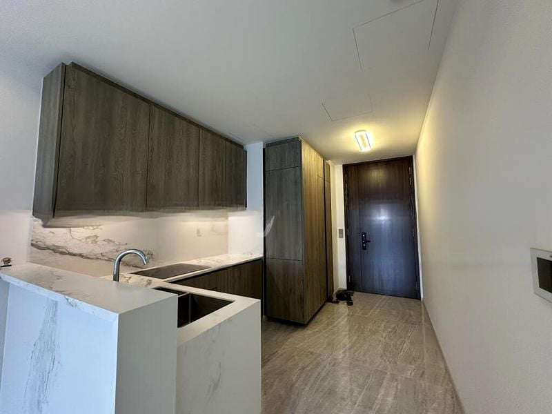 This exquisite unit features a well-thought-out layout, comprising three spacious bedrooms and two luxurious bathrooms, all adorned with high-end finishes. The galley kitchen boasts marble countertops and a stylish backsplash, equipped with a gas cooktop and built-in oven, perfect for culinary enthusiasts. The living area, with its marble-patterned feature wall and direct balcony access, is ideal for entertaining or unwinding after a long day.