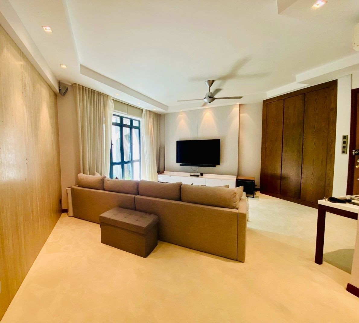 Step into this beautifully renovated 3-bedroom unit at East Meadows and feel the warmth of its cozy ambiance. The natural light filters through large windows, illuminating the elegant parquet flooring and highlighting the stunning wooden feature wall. The spacious living area, adorned with an L-shaped sofa and built-in floor-to-ceiling cabinets, invites you to relax and unwind while enjoying views of lush greenery.