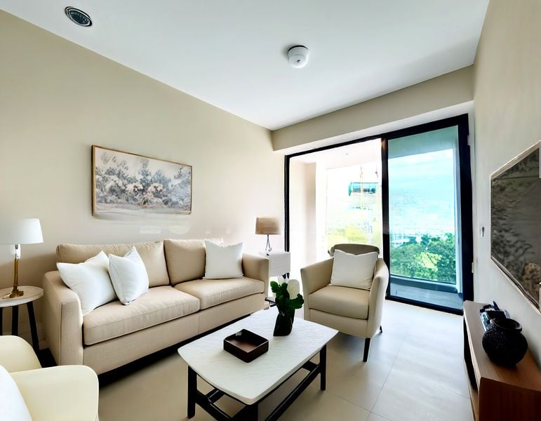 This 1-bedroom, 1-bathroom unit boasts an open-concept layout that seamlessly integrates the living, dining, and kitchen areas. The island kitchen, complete with stainless steel appliances and under-cabinet lighting, is perfect for both cooking and entertaining. The bathroom features a chic wall-hung toilet and a glass shower enclosure, complemented by modern vanity finishes. Each room is designed with comfort in mind, from the spacious bedroom with built-in wardrobes to the airy living room adorned with a chandelier.