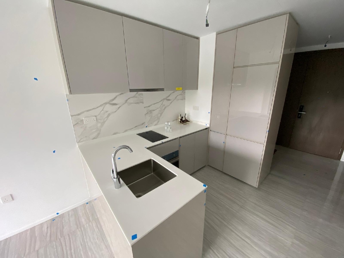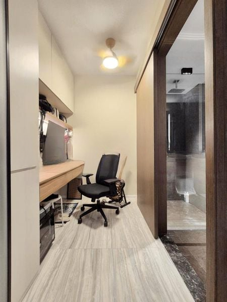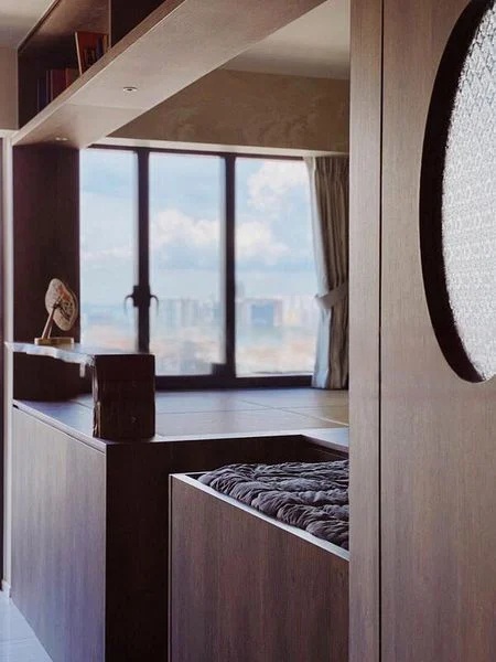 The layout features a custom wood platform bed with integrated storage, seamlessly blending functionality with style. The living area is thoughtfully designed with built-in wardrobes and a glass-top study desk, providing a perfect workspace. Step out onto the balcony to enjoy unobstructed views of the urban landscape, ideal for relaxation or entertaining.