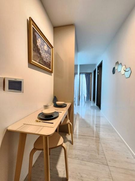 Step into a serene oasis where modern minimalist design meets abundant natural light. This well-maintained 1-bedroom unit at Parc Esta greets you with a stunning city skyline view through a circular window door, complemented by designer finishes that evoke a Japanese-inspired ambiance. The tatami-style flooring and textured pendant lighting create a warm, inviting atmosphere that feels both spacious and intimate.