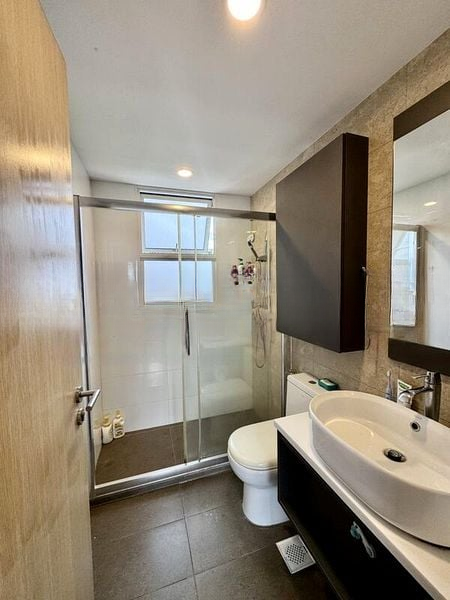 Step into a world of elegance as you enter this beautifully renovated 3-bedroom unit at Forestville. The abundant natural light floods the space, accentuating the large format floor tiles and the stunning dual modern chandeliers that create a bright and airy ambiance. Enjoy seamless access to the balcony through sheer curtains, offering a serene view of the surrounding residential landscape.