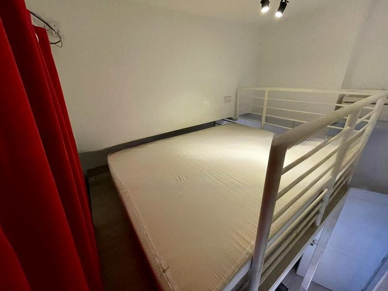 This well-maintained 1-bedroom unit features a stylish kitchen equipped with white shaker-style cabinets, a striking black backsplash, and a retro red refrigerator that serves as a conversation piece. The integrated induction cooktop and built-in oven make cooking a delight, while the dining area seamlessly connects to the living space, perfect for entertaining. Enjoy the comfort of minimalist furnishings and the convenience of a modern lifestyle in this thoughtfully designed home.