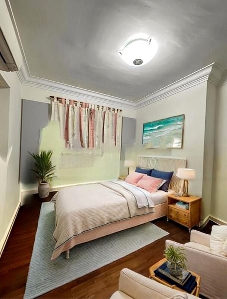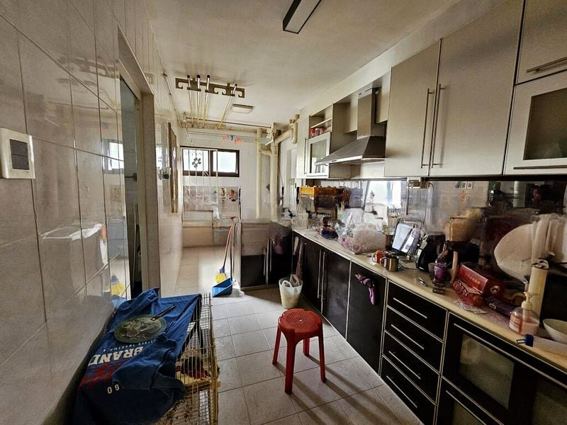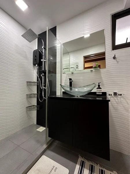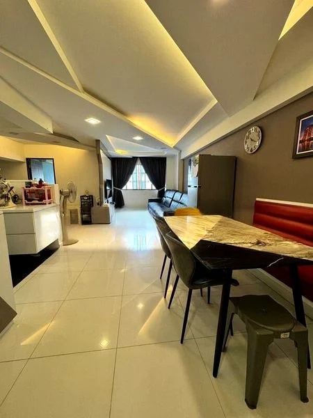 Step into this beautifully renovated 4-bedroom HDB flat and be greeted by an abundance of natural light cascading through large louvered windows, illuminating the modern minimalist design. The open living area features a sleek glass partition, enhancing the spacious feel while offering views of lush greenery and the urban landscape beyond.