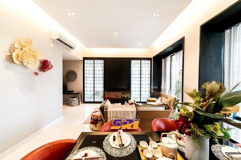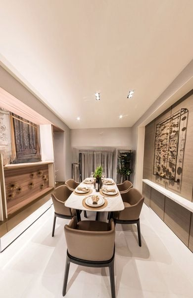 This Type F unit boasts a thoughtful layout with a private lift lobby, distinct living and dining zones, and bedrooms spread across two levels for enhanced privacy. The spacious balcony, adorned with wooden decking and a long bar counter, is perfect for entertaining while soaking in panoramic views. Each bathroom is a sanctuary, featuring full-height grey tiling and a separate bathtub for a touch of indulgence.