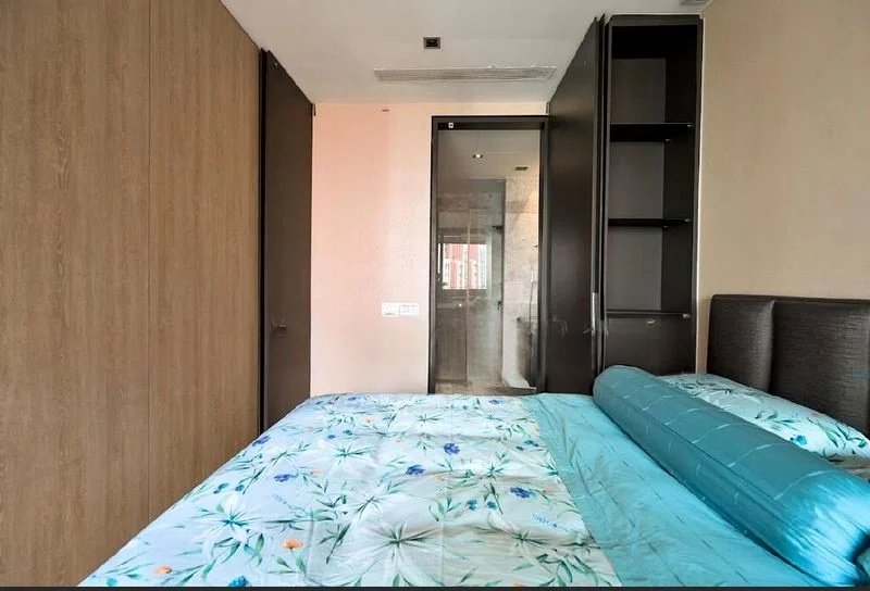 Step into a world of elegance as you enter this beautifully renovated 1-bedroom unit at OUE Twin Peaks. The abundant natural light floods the open-concept living space, accentuating the light wood flooring and the striking mirrored feature wall. Floor-to-ceiling sliding glass doors lead to a timber-decked balcony, offering unobstructed views of the city skyline and lush greenery, creating a serene ambiance that feels both luxurious and inviting.