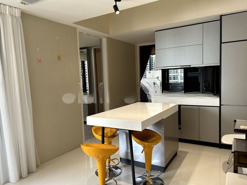 This efficient layout of 69 sqm showcases standout features including a sleek kitchen island with integrated appliances, a luxurious rain shower in the bathroom, and designer wall paneling in the bedroom. The unit also boasts a household shelter and a balcony, perfect for enjoying the serene surroundings. Every detail has been thoughtfully curated to offer a seamless blend of comfort and sophistication.
