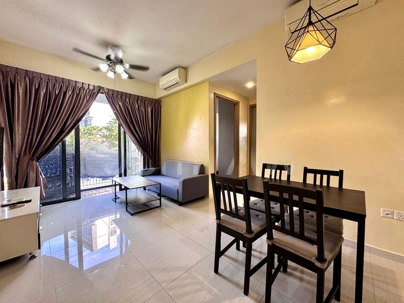 This well-maintained unit features two generous bedrooms, each with luxurious wooden parquet flooring and built-in wardrobes. The living room is designed for both relaxation and entertainment, complete with built-in storage and display cabinets. A dedicated study area offers a perfect nook for productivity, bathed in natural light, making it an ideal home office.