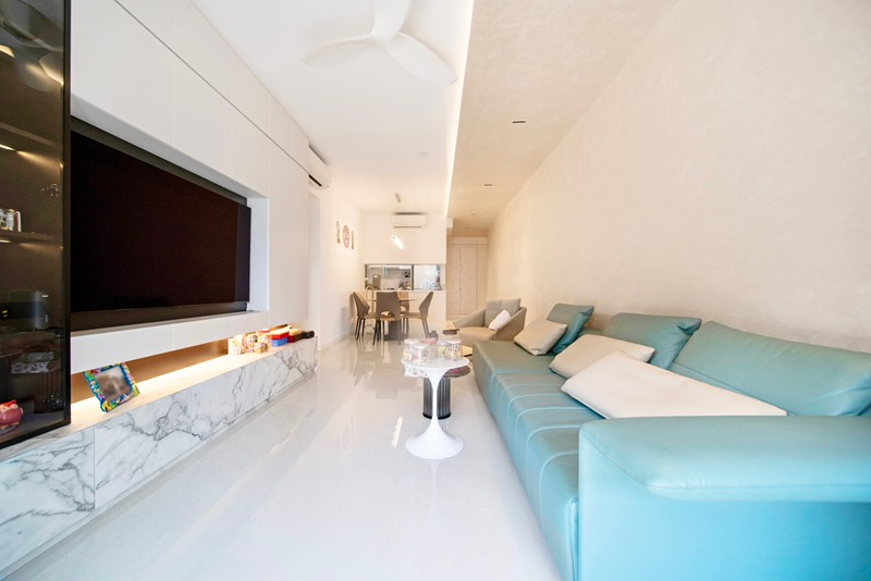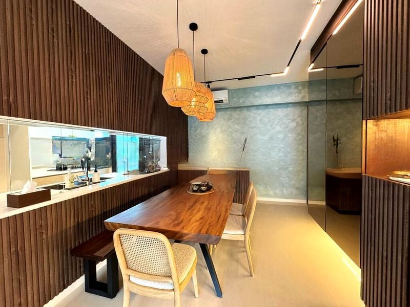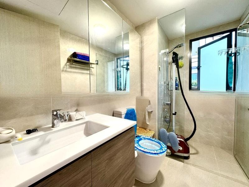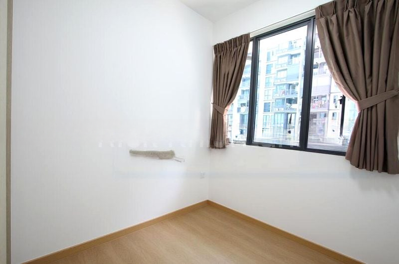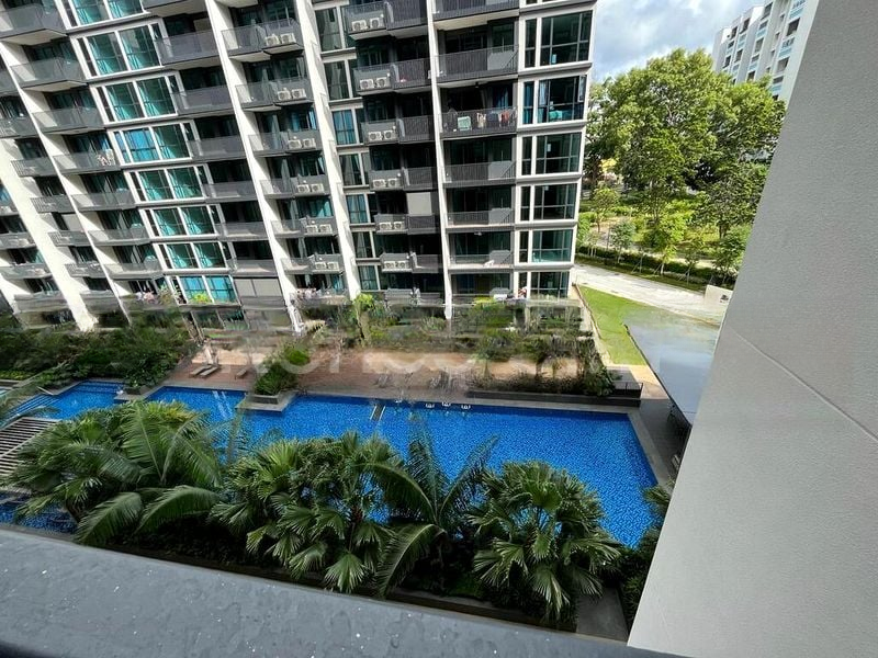 Step into a bright and airy sanctuary at TREASURE AT TAMPINES, where abundant natural light floods the space, highlighting the elegant finishes and thoughtful design. The living room welcomes you with sliding glass doors that open to a charming balcony, offering serene views of the pool and lush greenery, creating a tranquil atmosphere for relaxation.