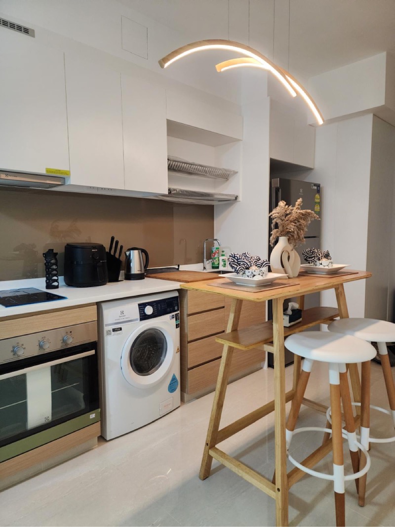 This well-maintained unit features a modern layout with two spacious bedrooms, including a study area, and a fully-equipped kitchen with induction hob and built-in oven. The dining area boasts a space-saving folding table, complemented by built-in storage cabinets that enhance functionality without compromising style. Enjoy the convenience of an integrated laundry setup in the kitchen, making everyday living effortless.
