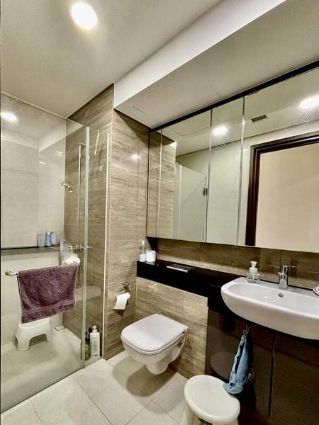 This well-maintained unit boasts an open concept layout, perfect for modern living. The living and dining area features marble-look flooring that flows seamlessly into the kitchen, equipped with wood-grain upper cabinets, a built-in oven, and a sleek black countertop. The bedrooms are designed for comfort, with built-in sliding wardrobes and light wood flooring, while the bathrooms showcase stylish finishes, including glass shower screens and wall-hung toilets.
