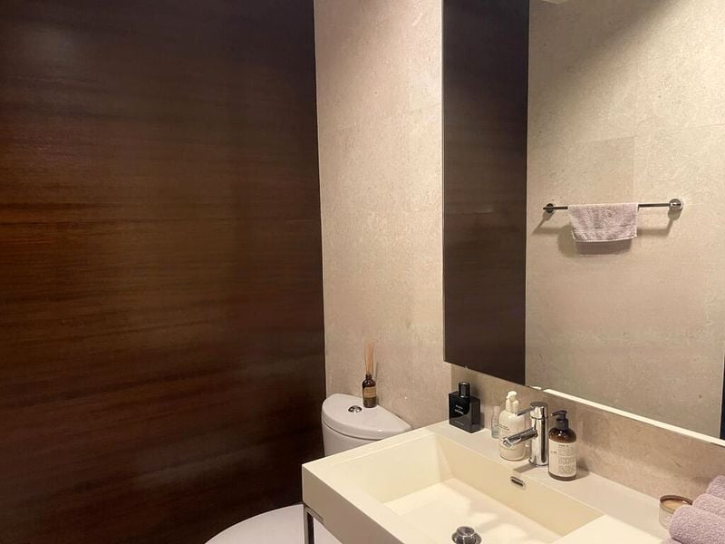 The well-maintained layout features four spacious bedrooms, including a master suite with a king-sized bed and dedicated vanity area. The stunning marble double vanity in the bathroom, complemented by frosted glass partitions and modern wall sconces, exudes elegance. The open-plan dining area boasts a large dark wood table, seamlessly connecting to a contemporary kitchen equipped with an integrated wine chiller and dark wood cabinetry, perfect for entertaining.