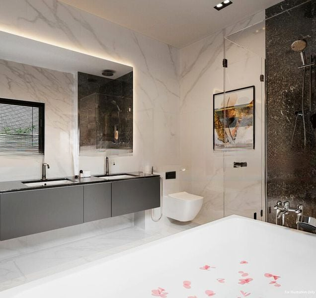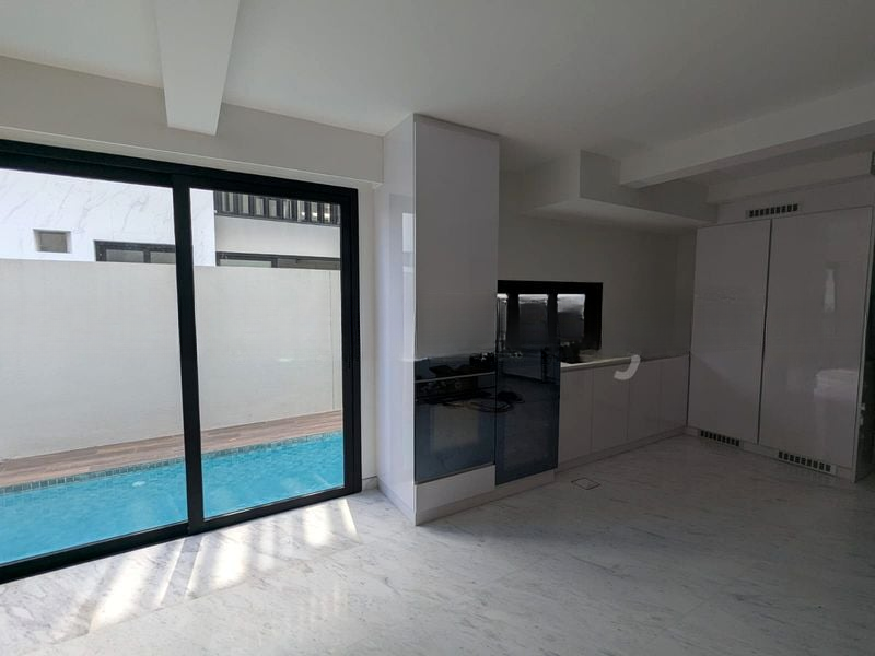Step into a world of modern luxury as you enter this brand-new designer terrace at The Carrara. Bathed in natural light, the open-concept living space features soaring high ceilings and a stunning marble TV feature wall, complemented by designer lighting fixtures that create an inviting ambiance. Floor-to-ceiling windows in the dining room offer picturesque views of the lush surroundings, while the marble dining table sets the stage for elegant gatherings.