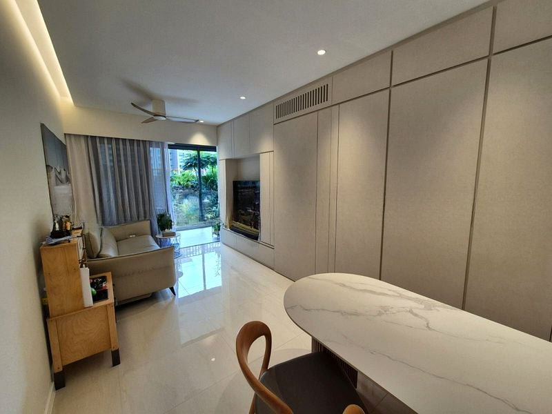 Step into a world of modern elegance as you enter this beautifully designed unit at The Florence Residences. The ambiance is instantly inviting, with natural light filtering through floor-to-ceiling windows, illuminating the custom floor-to-ceiling TV console and the striking wood-slat feature wall. Enjoy serene views of the lush greenery and resort-style swimming pool from your living space, creating a tranquil retreat right at home.