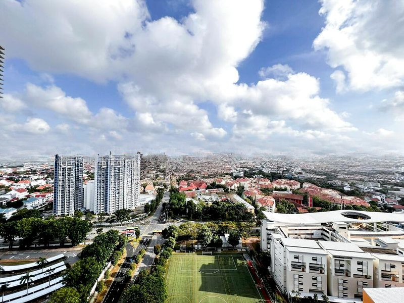 Step into a bright and airy sanctuary where abundant natural light floods the space, accentuating the minimalist decor and modern finishes. The unobstructed panoramic views of the city skyline and lush greenery create an inviting ambiance, making every moment spent here feel special. The large balcony, accessible through floor-to-ceiling glass doors, beckons you to unwind while soaking in the stunning vistas of the sports field below.
