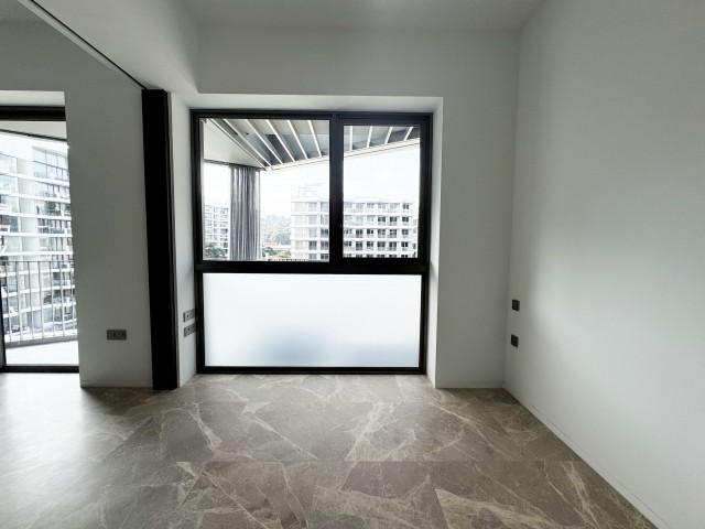 This efficient 538 sqft layout boasts a linear kitchen equipped with integrated appliances, two-tone cabinetry, and stylish under-cabinet lighting. The bedroom features a built-in dark wood sliding wardrobe and a large frosted privacy glass window, ensuring both comfort and privacy. The bathroom is a masterpiece with a wall-hung toilet, floating vanity, and elegant stone-look wall tiles, complemented by black designer fixtures that add a touch of sophistication.