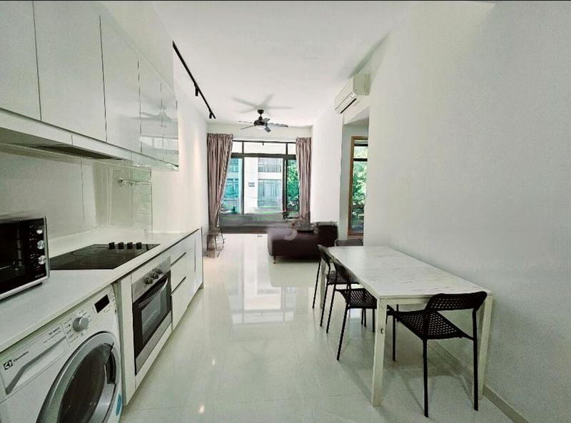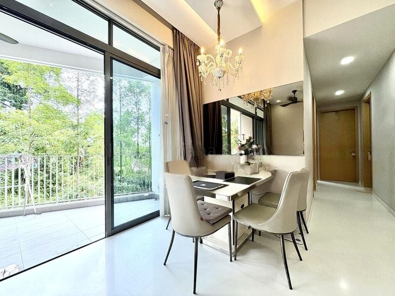 Step into a bright and airy sanctuary at The Skywoods, where abundant natural light floods the space, highlighting the elegant finishes and inviting ambiance. The living room, adorned with a stylish patterned feature wall, opens up to a balcony that offers stunning views of lush greenery and the shimmering pool, creating a perfect backdrop for relaxation.
