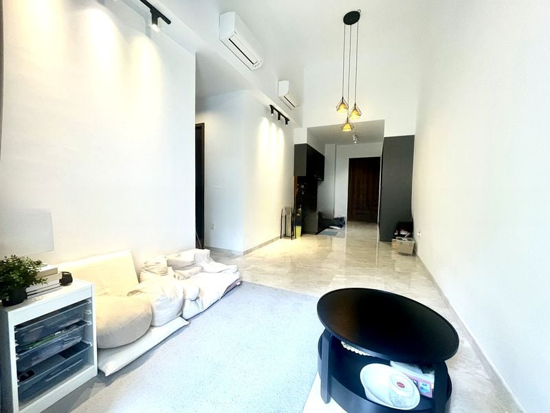 This well-maintained 2-bedroom unit features an open-concept layout that seamlessly connects the living room and modern kitchen. The kitchen boasts dark grey cabinetry and integrated appliances, while the living area is perfect for relaxation with its stylish pendant lighting and cozy bean bag sofa. Enjoy your morning coffee on the private balcony, equipped with wooden folding chairs and a stunning view of nature.