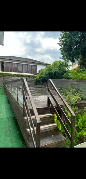 This well-maintained unit boasts four spacious bedrooms, each featuring herringbone parquet flooring and built-in wardrobes. The internal staircase leads you to the heart of the home, while the private outdoor wooden deck offers a perfect retreat for relaxation, complete with glass railings and an artificial turf area for a touch of greenery.